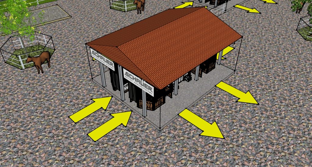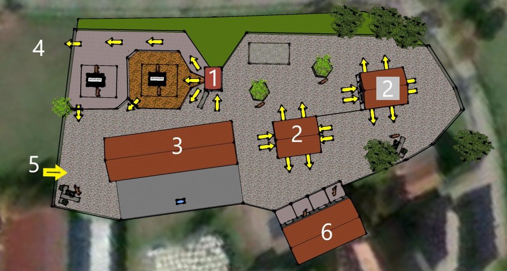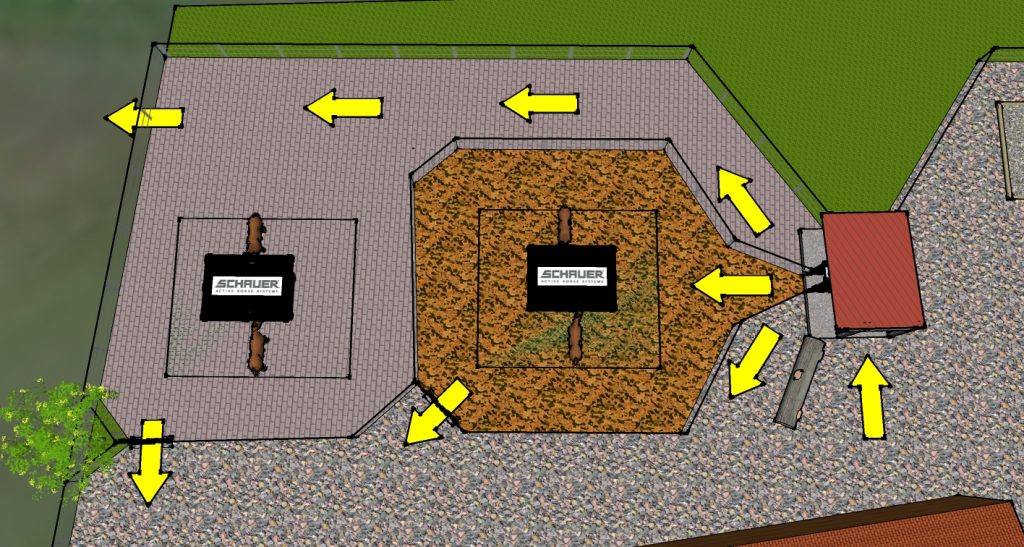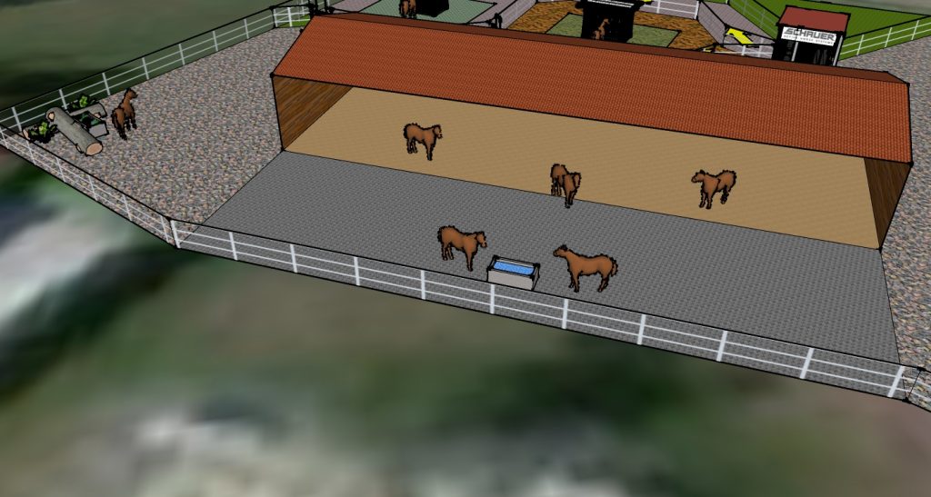 Das Pferd hat die ganze Zeit die Möglichkeit die Koppel wieder zu verlassen. Wir haben auf der Koppelfläche bewusst keine Tränke installiert, sodass das Pferd zum Trinken wieder zurück in den Aktivstall gehen muss (So lässt sich gewährleisten, dass das „Lauftier“ Pferd auch wirklich zum Laufen animiert wird.