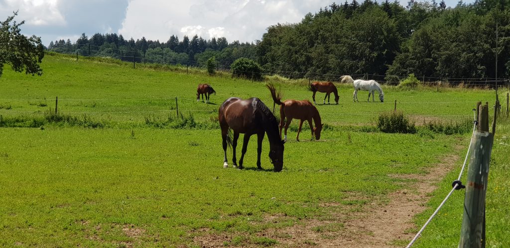 Neben unserer Koppelfläche von ca. 15 Hektar bewirtschaften wir über 40 Hektar Grünland. Dadurch sind wir in der Lage das komplette Heu das unsere Pferde das Jahr über fressen selbst zu produzieren. Getreu unserem Motto: „Für eine gute Heu-Qualität sorgt man am Besten selbst!“